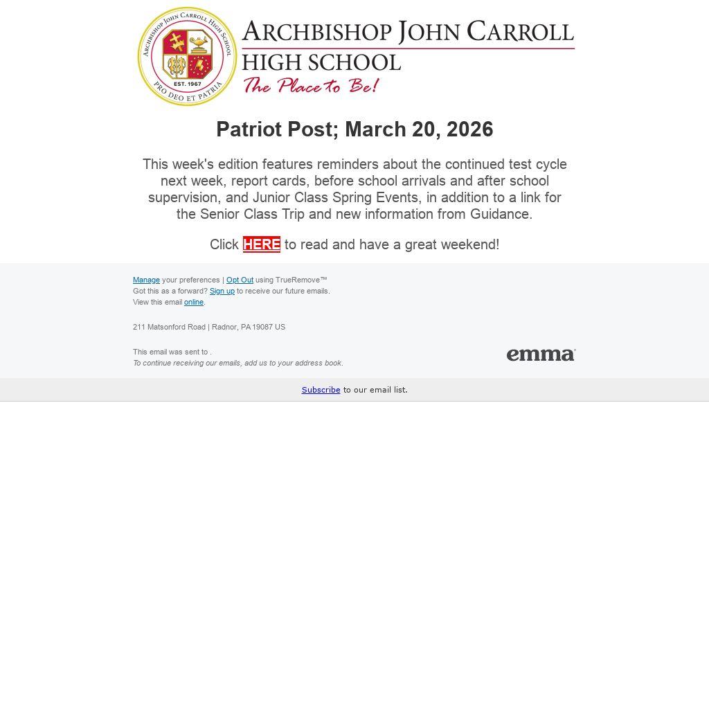 This week's edition features reminders about the continued test cycle next week, report cards, before school arrivals and after school supervision, and Junior Class Spring Events, in addition to a link for the Senior Class Trip and new information from Guidance.