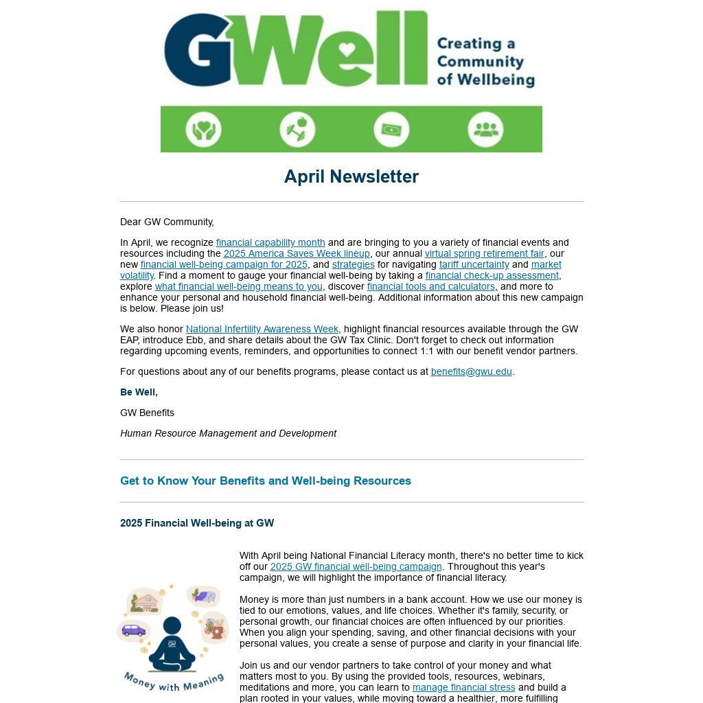 With April being National Financial Literacy month, there's no better time to kick off our 2025 GW financial well-being campaign. Throughout this year's campaign, we will highlight the importance of financial literacy.