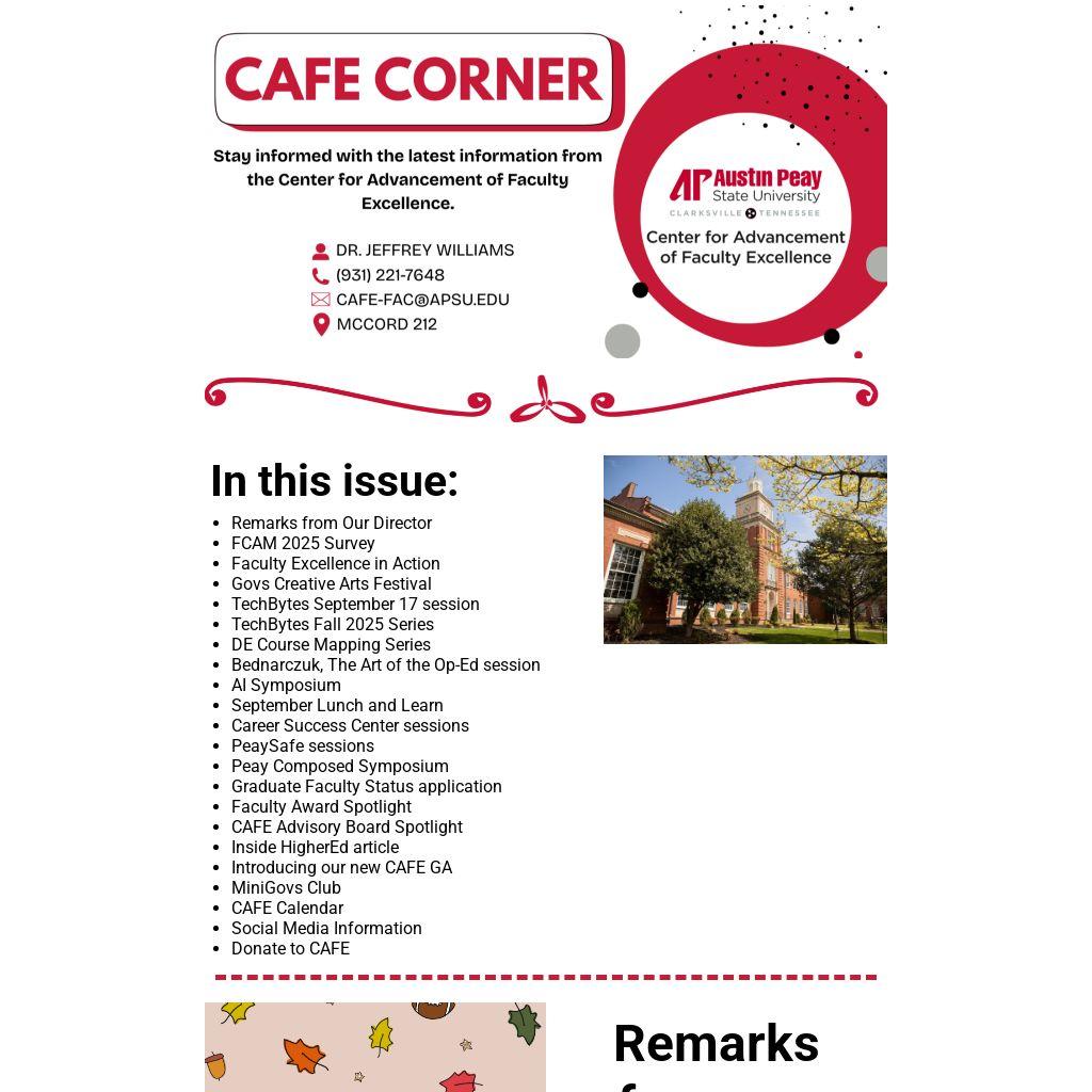 We had our first CAFE Advisory Board meeting this past Friday and I hope you'll be able to make time to complete the FCAM Survey that was sent via e-mail on Monday and shared below here in the newsletter. As always, we welcome your ideas on how CAFE can better serve you. Please don't hesitate to reach out at williamsjj@apsu.edu or 931-221-7648.