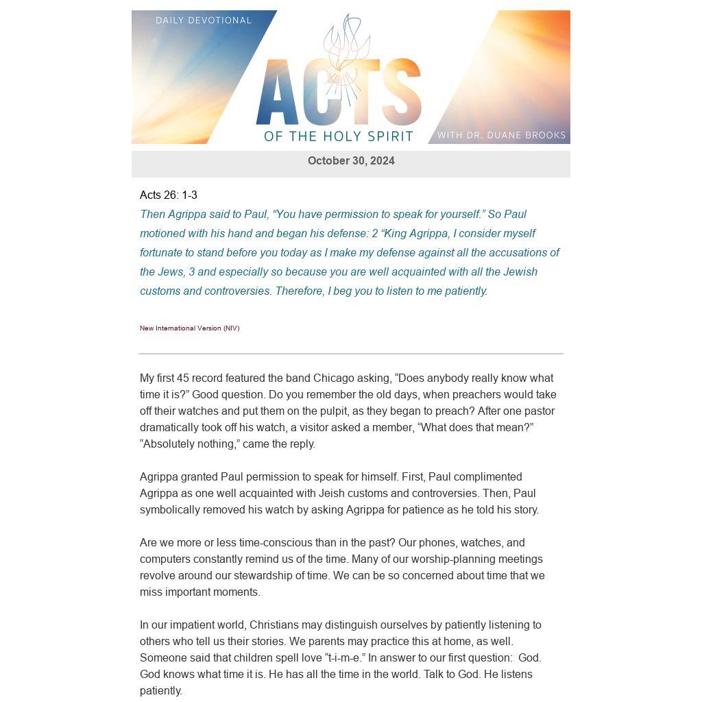 My first 45 record featured the band Chicago asking, “Does anybody really know what time it is?” Good question. Do you remember the old days, when preachers would take off their watches and put them on the pulpit, as they began to preach? After one pastor dramatically took off his watch, a visitor asked a member, “What does that mean?” “Absolutely nothing,” came the reply.