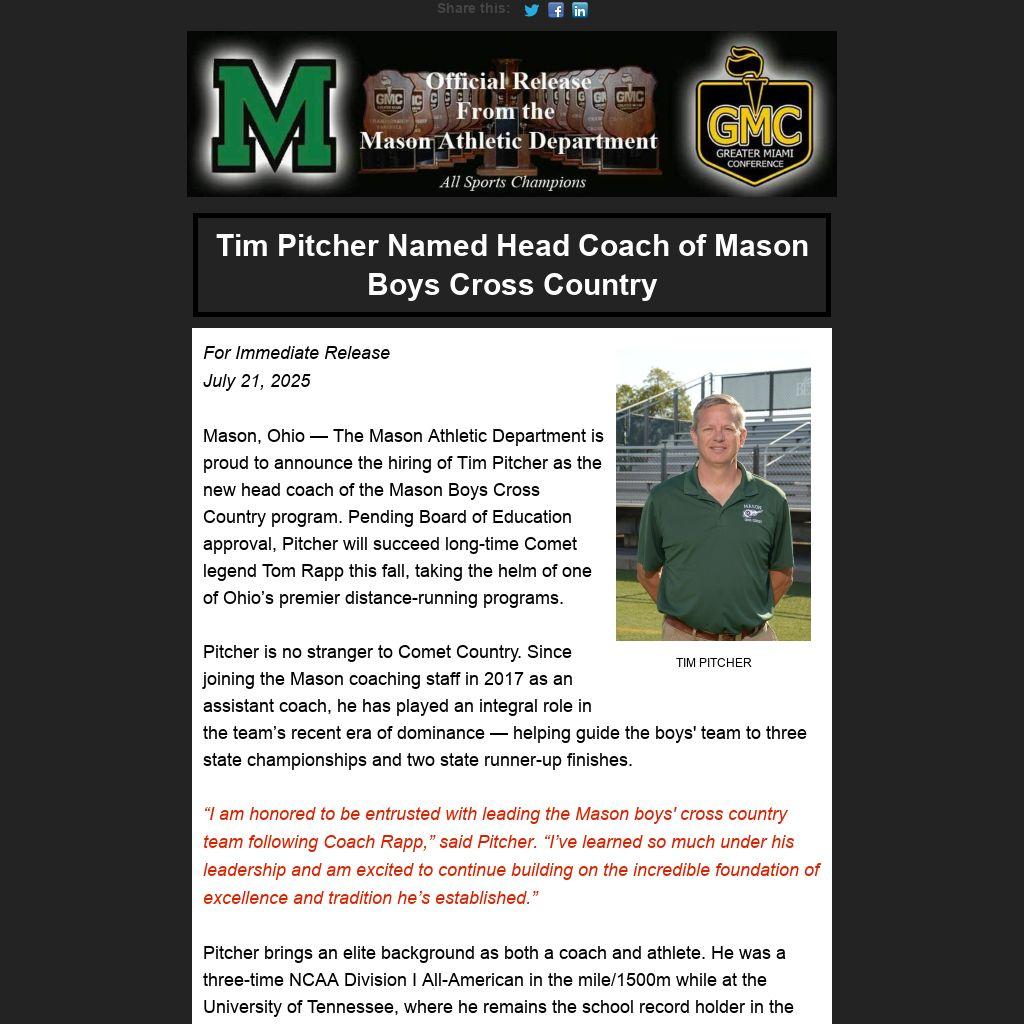 “I am honored to be entrusted with leading the Mason boys' cross country team following Coach Rapp,” said Pitcher. “I’ve learned so much under his leadership and am excited to continue building on the incredible foundation of excellence and tradition he’s established.”