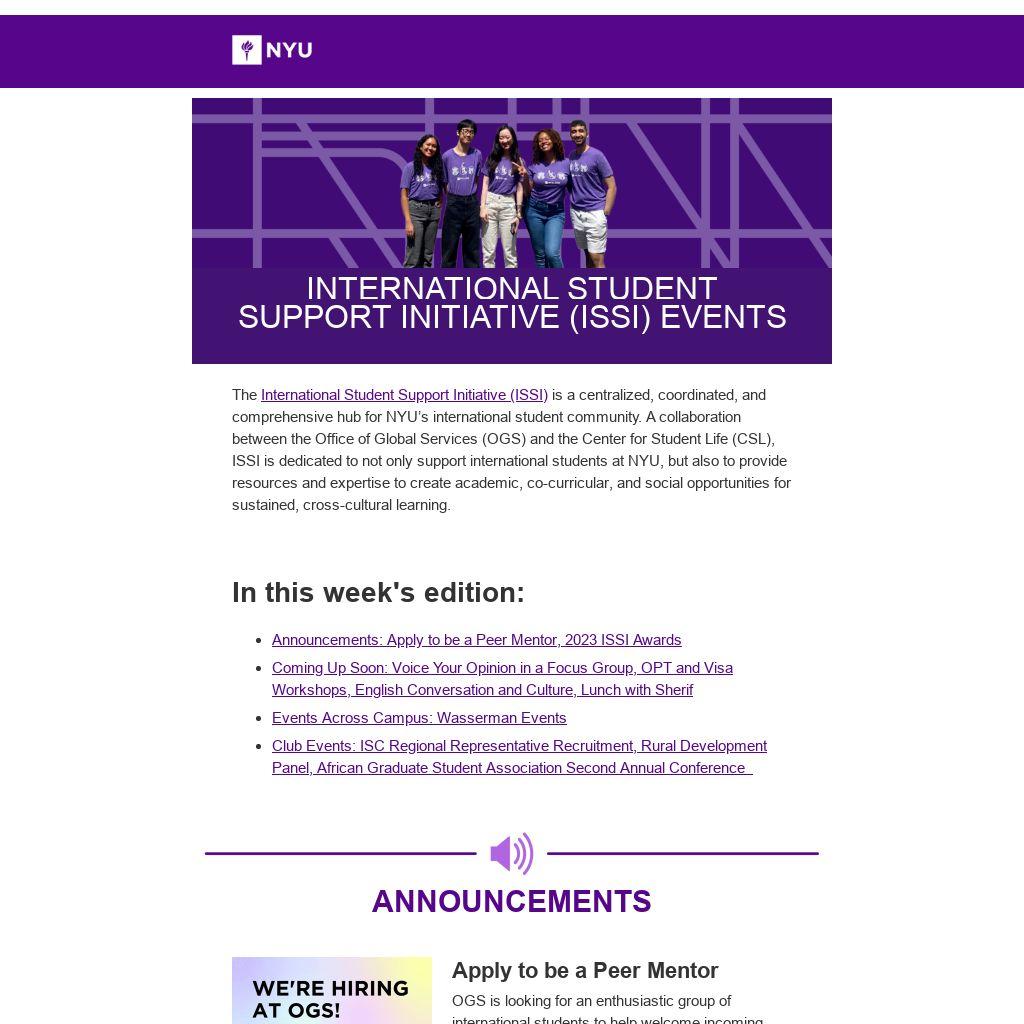 The International Student Support Initiative (ISSI) is a centralized, coordinated, and comprehensive hub for NYU’s international student community. A collaboration between the Office of Global Services (OGS) and the Center for Student Life (CSL), ISSI is dedicated to not only support international students at NYU, but also to provide resources and expertise to create academic, co-curricular, and social opportunities for sustained, cross-cultural learning.