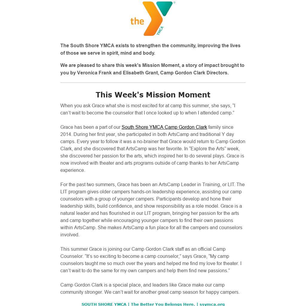 Grace has been a part of our South Shore YMCA Camp Gordon Clark family since 2014. During her first year, she participated in both ArtsCamp and traditional Y day camps. Every year to follow it was a no-brainer that Grace would return to Camp Gordon Clark, and she discovered that ArtsCamp was her favorite. In “Explore the Arts” week, she discovered her passion for the arts, which inspired her to do several plays. Grace is now involved with theater and arts programs outside of camp thanks to her ArtsCamp experience.