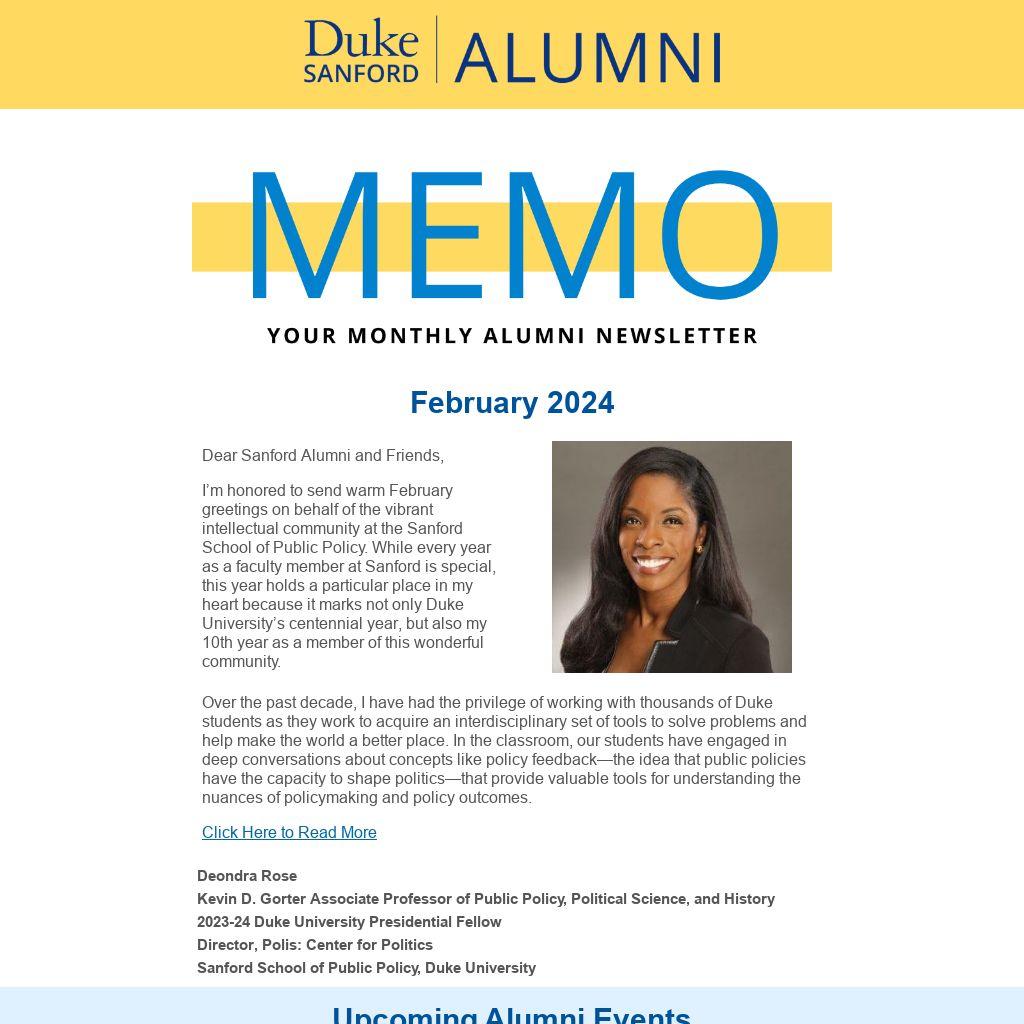 I’m honored to send warm February greetings on behalf of the vibrant intellectual community at the Sanford School of Public Policy. While every year as a faculty member at Sanford is special, this year holds a particular place in my heart because it marks not only Duke University’s centennial year, but also my 10th year as a member of this wonderful community.