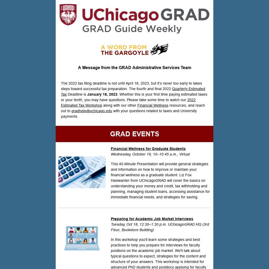 The 2022 tax filing deadline is not until April 18, 2023, but it’s never too early to takes steps toward successful tax preparation. The fourth and final 2022 Quarterly Estimated Tax Deadline is January 18, 2023. Whether this is your first time paying estimated taxes or your tenth, you may have questions. Please take some time to watch our 2022 Estimated Tax Workshop along with our other Financial Wellness resources, and reach out to gradhelp@uchicago.edu with your questions related to taxes and University payments.