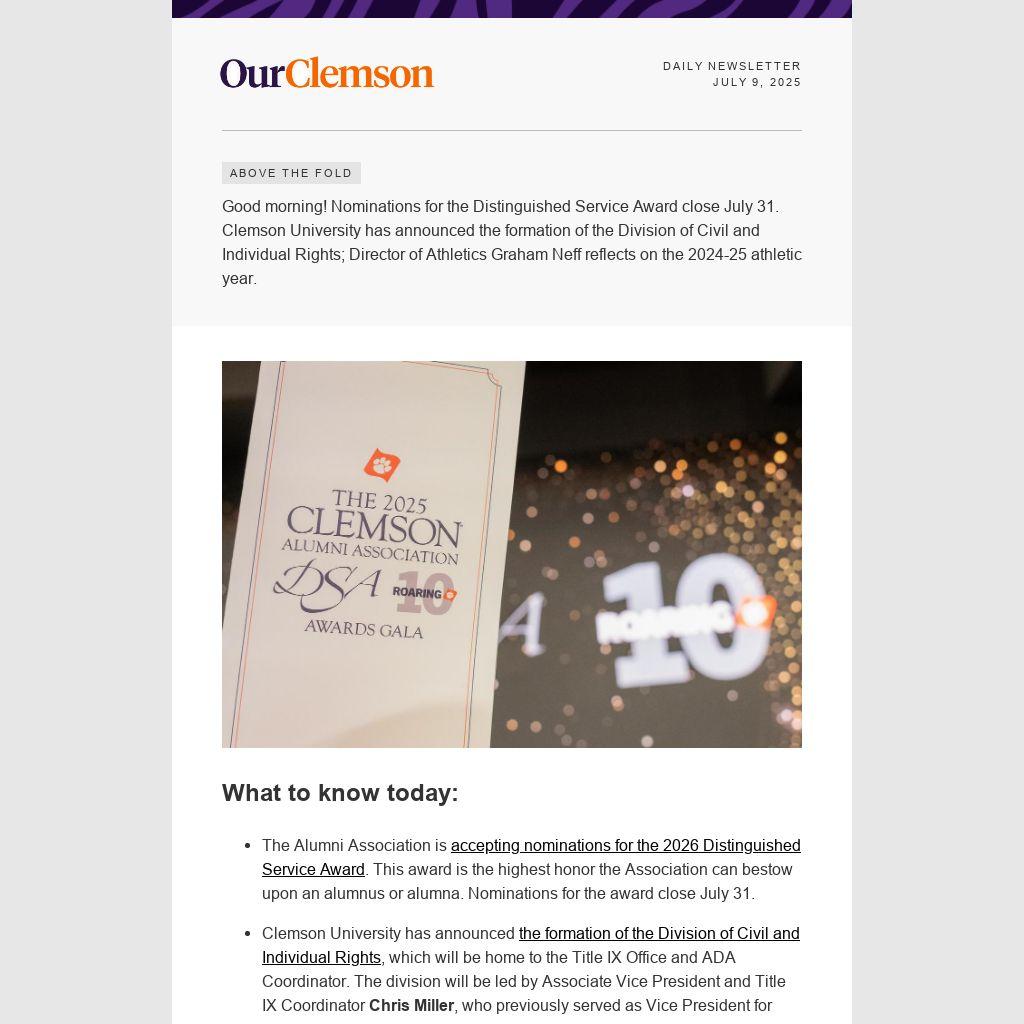 Clemson University has announced the formation of the Division of Civil and Individual Rights; Director of Athletics Graham Neff reflects on the 2024-25 athletic year.