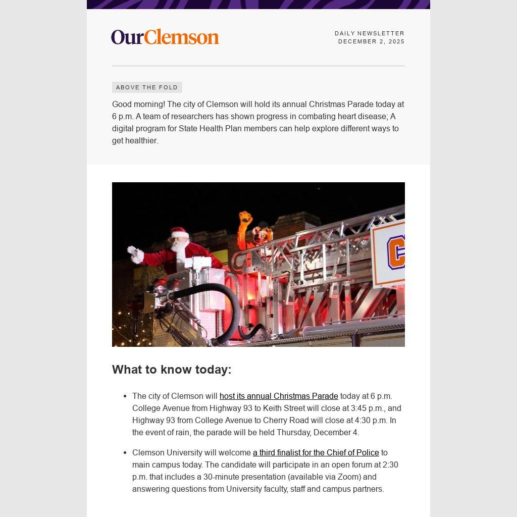 Good morning! The city of Clemson will hold its annual Christmas Parade today at 6 p.m. A team of researchers has shown progress in combating heart disease; A digital program for State Health Plan members can help explore different ways to get healthier.