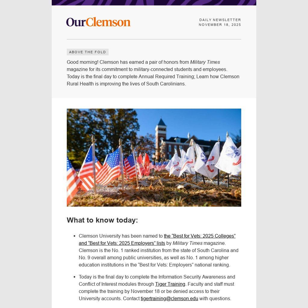 Good morning! Clemson has earned a pair of honors from Military Times magazine for its commitment to military-connected students and employees. Today is the final day to complete Annual Required Training; Learn how Clemson Rural Health is improving the lives of South Carolinians.