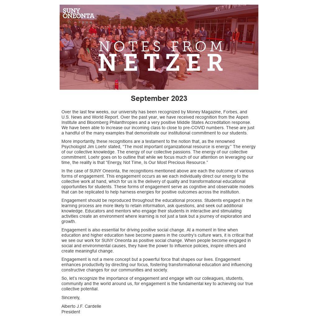 Effective this month, notes from meetings of the President's Cabinet will be made available to the university community. They will be shared once a month in Notes from Netzer. Questions can be directed to president@oneonta.edu.