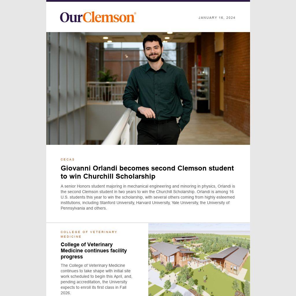 A senior Honors student majoring in mechanical engineering and minoring in physics, Orlandi is the second Clemson student in two years to win the Churchill Scholarship. Orlandi is among 16 U.S. students this year to win the scholarship, with several others coming from highly esteemed institutions, including Stanford University, Harvard University, Yale University, the University of Pennsylvania and others.