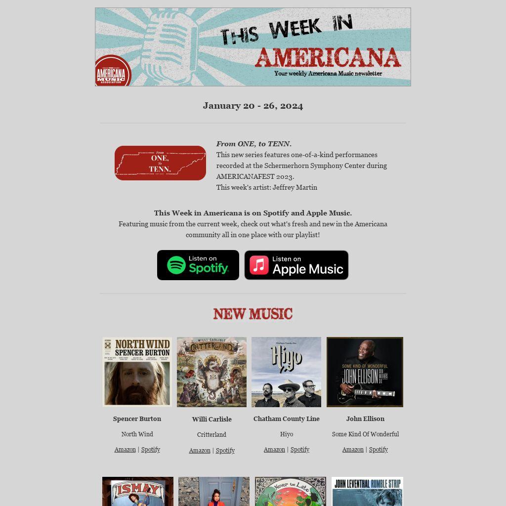 This Week in Americana is on Spotify and Apple Music. Featuring music from the current week, check out what's fresh and new in the Americana community all in one place with our playlist!