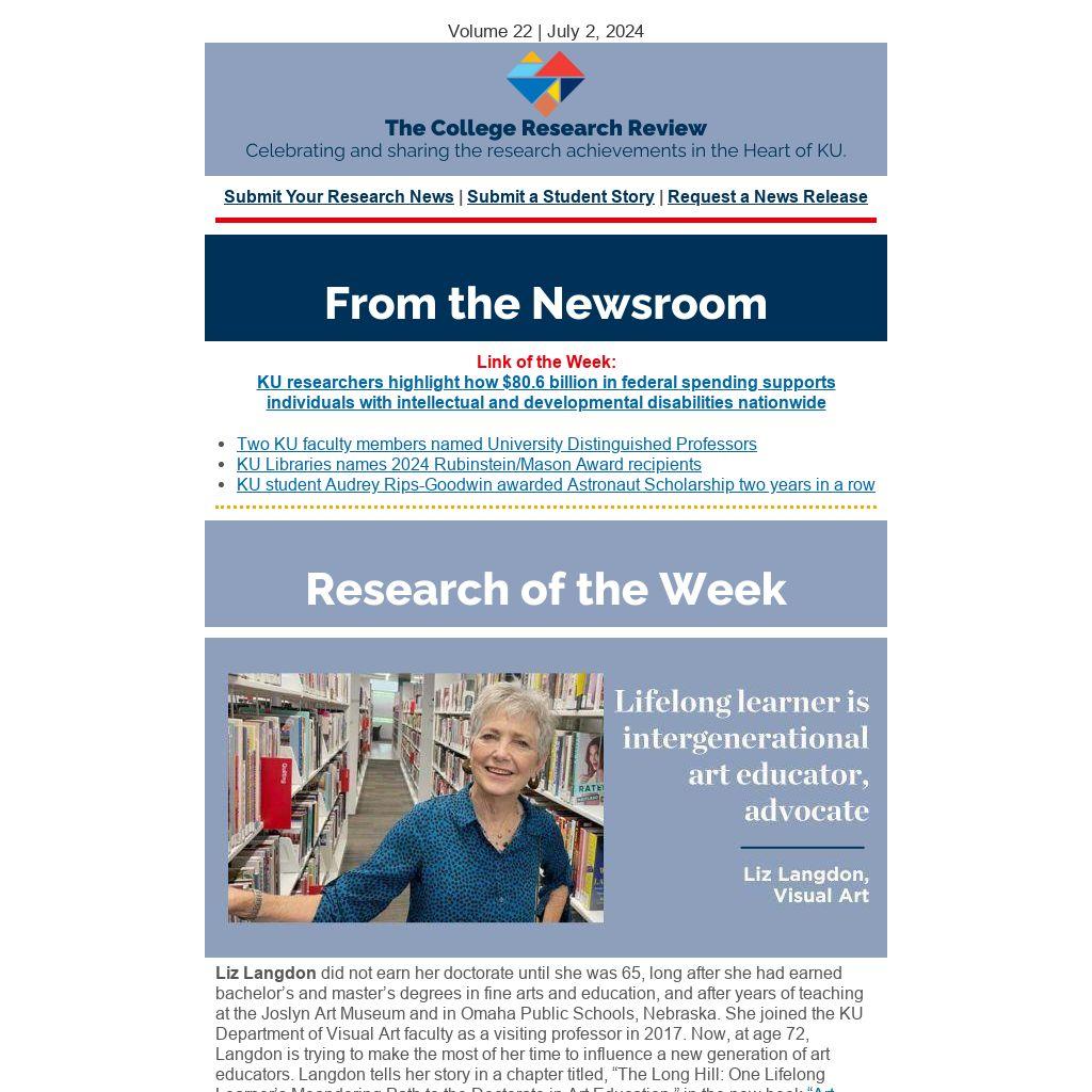 Liz Langdon did not earn her doctorate until she was 65, long after she had earned bachelor’s and master’s degrees in fine arts and education, and after years of teaching at the Joslyn Art Museum and in Omaha Public Schools, Nebraska. She joined the KU Department of Visual Art faculty as a visiting professor in 2017. Now, at age 72, Langdon is trying to make the most of her time to influence a new generation of art educators. Langdon tells her story in a chapter titled, “The Long Hill: One Lifelong Learner’s Meandering Path to the Doctorate in Art Education,” in the new book “Art Education and Creative Aging: Older Adults as Learners, Makers, and Teachers of Art” (Routledge). Congrats, Liz! We're so grateful to have you in the College.