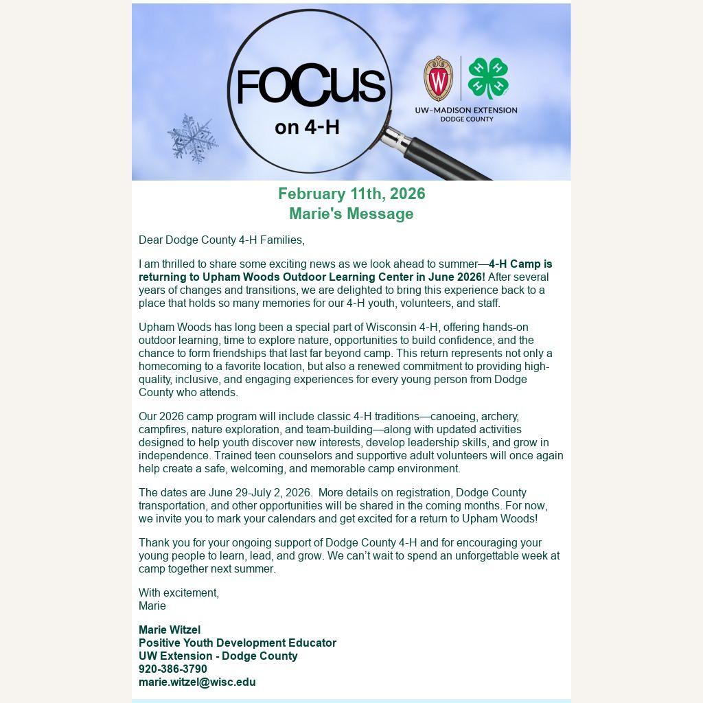 I am thrilled to share some exciting news as we look ahead to summer—4‑H Camp is returning to Upham Woods Outdoor Learning Center in June 2026! After several years of changes and transitions, we are delighted to bring this experience back to a place that holds so many memories for our 4‑H youth, volunteers, and staff.