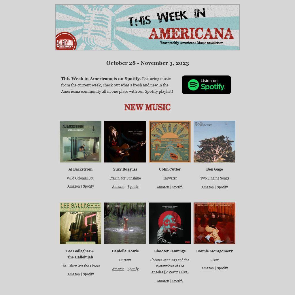 This Week in Americana is on Spotify. Featuring music from the current week, check out what's fresh and new in the Americana community all in one place with our Spotify playlist!