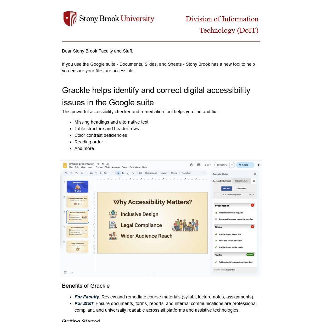 Explore Grackle as you work in your Google Drive. Updating materials is a big job. Accessibility checkers like Grackle will help you learn accessibility requirements and get used to building files that are fully accessible. Together, let’s take a significant step toward fostering an inclusive academic environment.