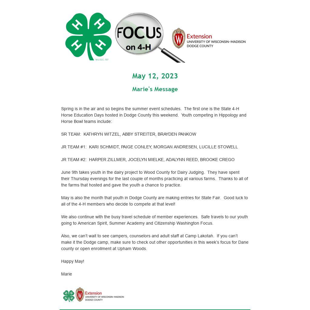 May is also the month that youth in Dodge County are making entries for State Fair. Good luck to all of the 4-H members who decide to compete at that level!