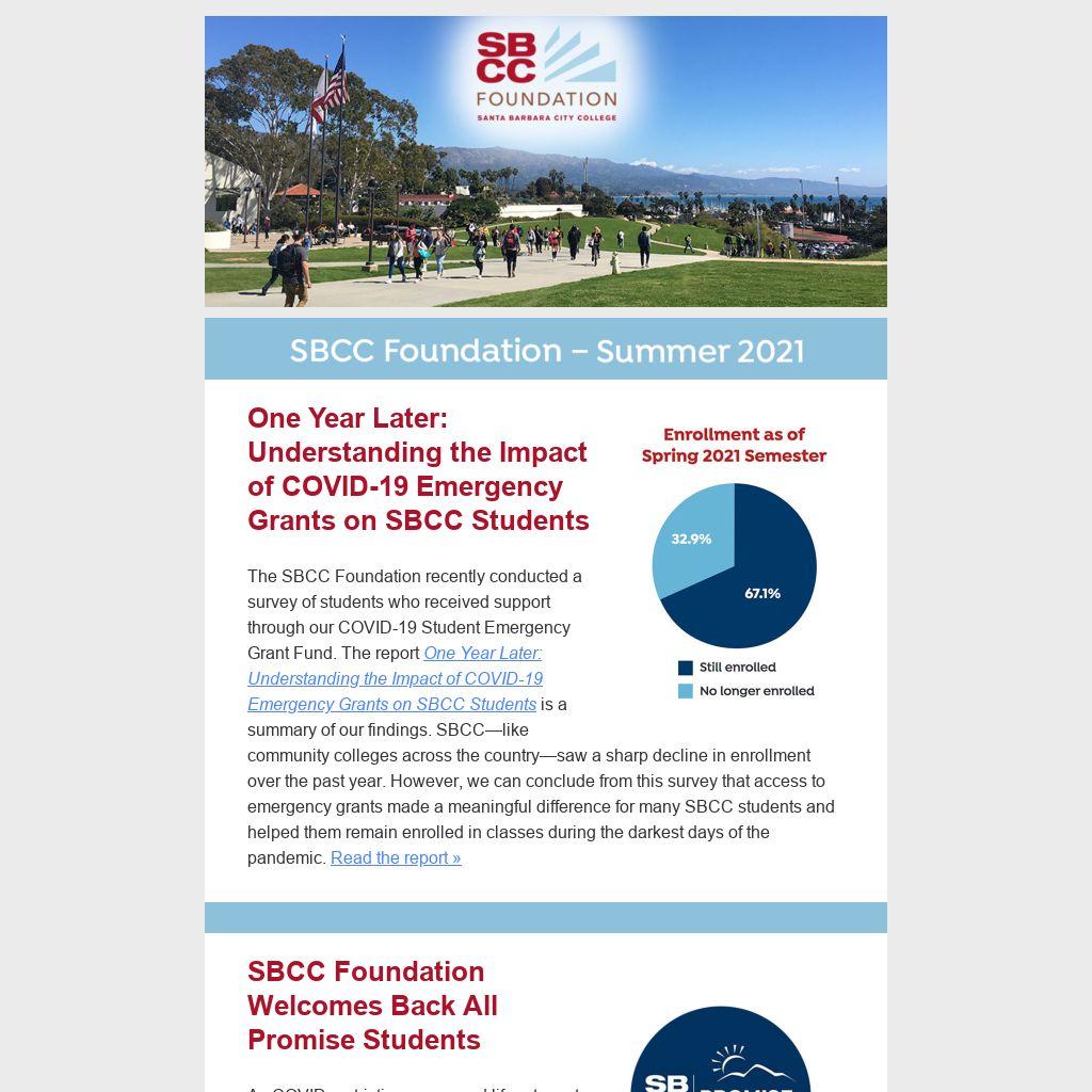 The SBCC Foundation recently conducted a survey of students who received support through our COVID-19 Student Emergency Grant Fund. The report One Year Later: Understanding the Impact of COVID-19 Emergency Grants on SBCC Students is a summary of our findings. SBCC—like community colleges across the country—saw a sharp decline in enrollment over the past year. However, we can conclude from this survey that access to emergency grants made a meaningful difference for many SBCC students and helped them remain enrolled in classes during the darkest days of the pandemic. Read the report »