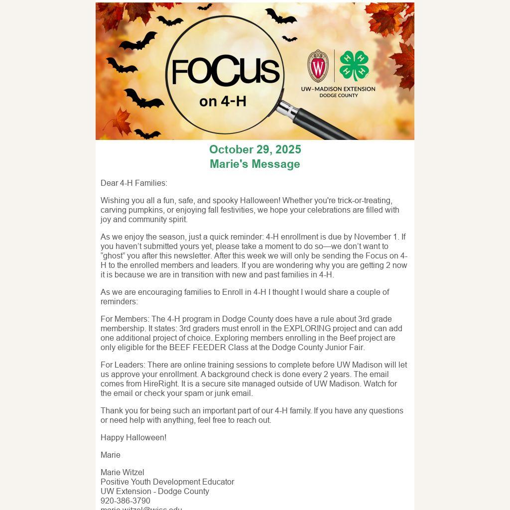 As we enjoy the season, just a quick reminder: 4-H enrollment is due by November 1. If you haven’t submitted yours yet, please take a moment to do so—we don’t want to “ghost” you after this newsletter. After this week we will only be sending the Focus on 4-H to the enrolled members and leaders. If you are wondering why you are getting 2 now it is because we are in transition with new and past families in 4-H.