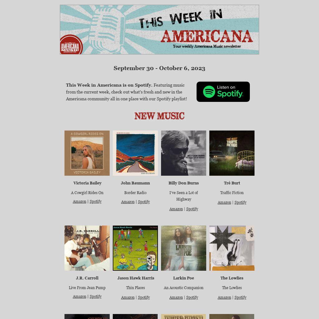 This Week in Americana is on Spotify. Featuring music from the current week, check out what's fresh and new in the Americana community all in one place with our Spotify playlist!