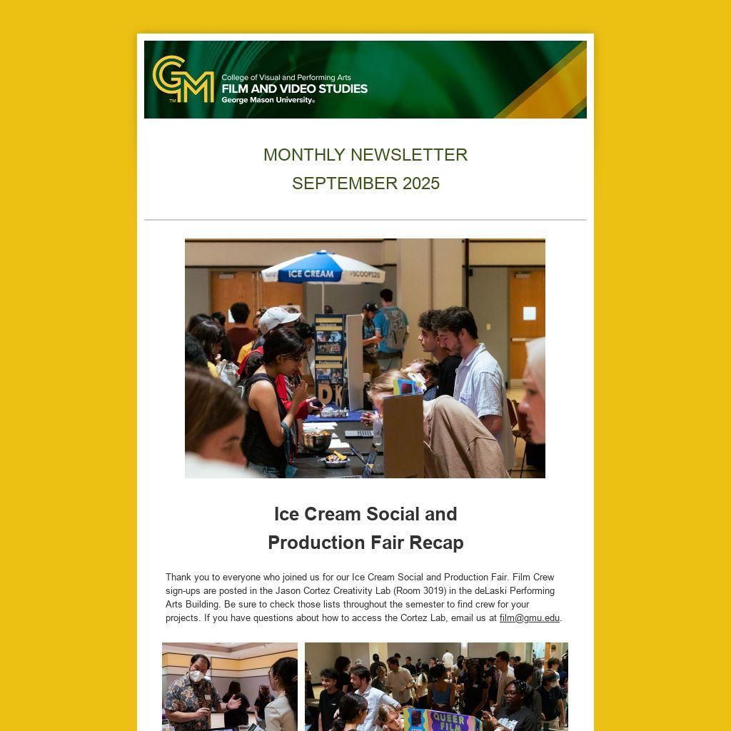 Thank you to everyone who joined us for our Ice Cream Social and Production Fair. Film Crew sign-ups are posted in the Jason Cortez Creativity Lab (Room 3019) in the deLaski Performing Arts Building. Be sure to check those lists throughout the semester to find crew for your projects. If you have questions about how to access the Cortez Lab, email us at film@gmu.edu.