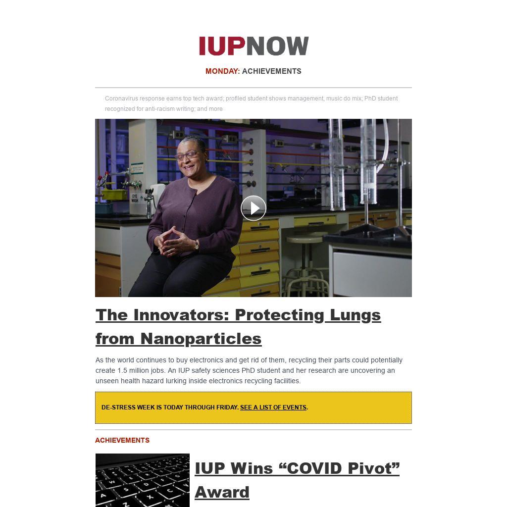 Distributed to IUP employees and students four days a week, IUP Now is the official newsletter of Indiana University of Pennsylvania. It features news from across the IUP website, compiled by the Division of Marketing and Communications. Find out how to get your news and events in IUP Now.