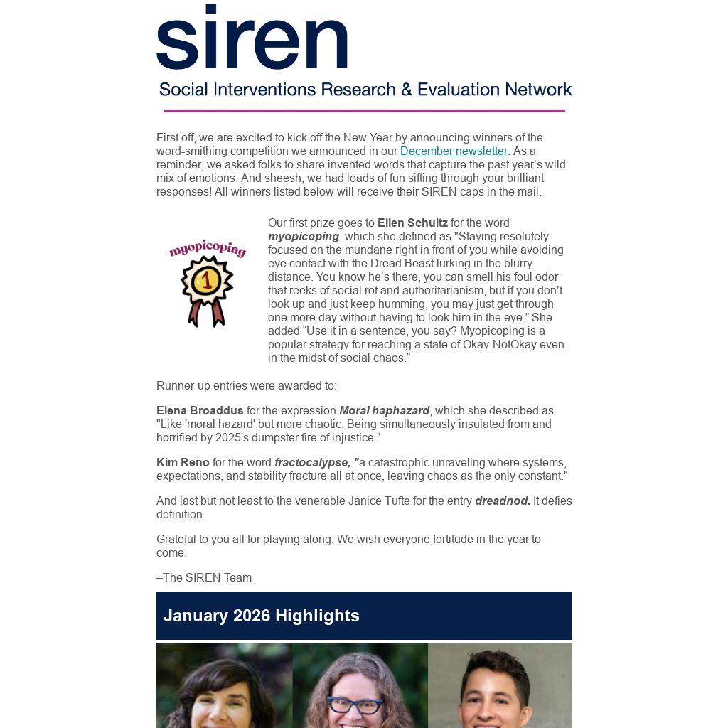 First off, we are excited to kick off the New Year by announcing winners of the word-smithing competition we announced in our December newsletter. As a reminder, we asked folks to share invented words that capture the past year’s wild mix of emotions. And sheesh, we had loads of fun sifting through your brilliant responses! All winners listed below will receive their SIREN caps in the mail.