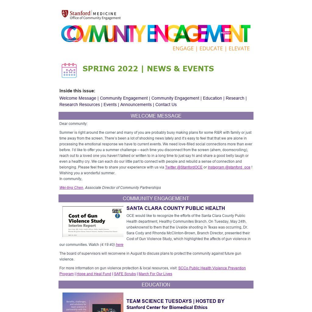Summer is right around the corner and many of you are probably busy making plans for some R&R with family or just time away from the screen. There’s been a lot of shocking news lately and it’s easy to feel that that we are alone in processing the emotional response we have to current events. We need love-filled social connections more than ever before. I’d like to offer you a summer challenge – each time you disconnect from the screen (ahem, doomscrolling), reach out to a loved one you haven’t talked or written to in a long time to just say hi and share a good belly laugh or even a healthy cry. We can each do our little part to connect with people and rebuild a sense of connection and belonging. Please feel free to share your experience with us via Twitter @StanfordOCE or Instagram @stanford_oce ! Wishing you a wonderful summer.
