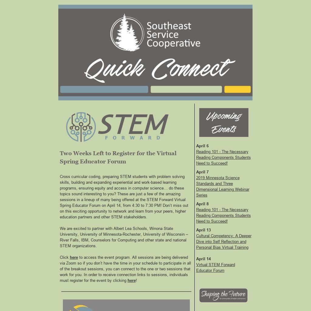Cross curricular coding, preparing STEM students with problem solving skills, building and expanding experiential and work-based learning programs, ensuring equity and access in computer science… do these topics sound interesting to you? These are just a few of the amazing sessions in a lineup of many being offered at the STEM Forward Virtual Spring Educator Forum on April 14, from 4:30 to 7:30 PM! Don’t miss out on this exciting opportunity to network and learn from your peers, higher education partners and other STEM stakeholders.