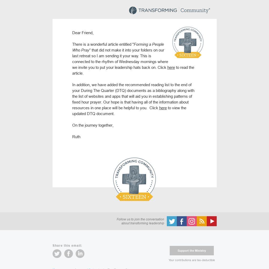 Forming a People Who Pray” that did not make it into your folders on our last retreat so I am sending it your way. This is connected to the rhythm of Wednesday mornings where we invite you to put your leadership hats back on. Click