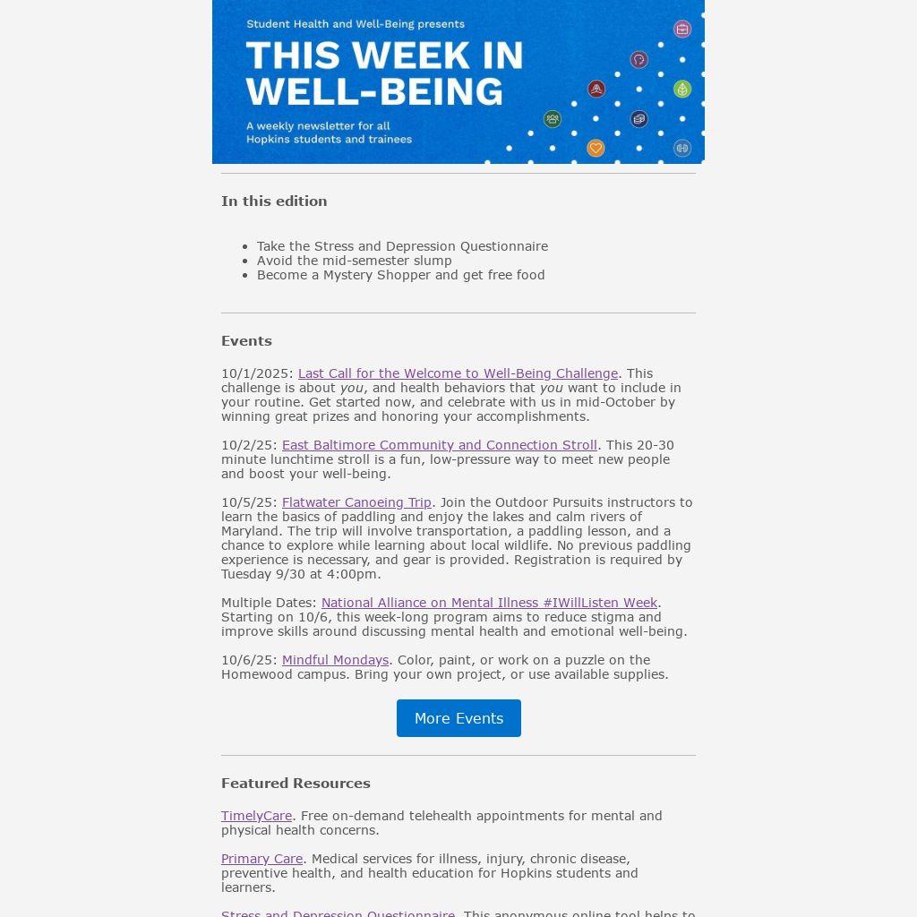 10/1/2025: Last Call for the Welcome to Well-Being Challenge. This challenge is about you, and health behaviors that you want to include in your routine. Get started now, and celebrate with us in mid-October by winning great prizes and honoring your accomplishments.
