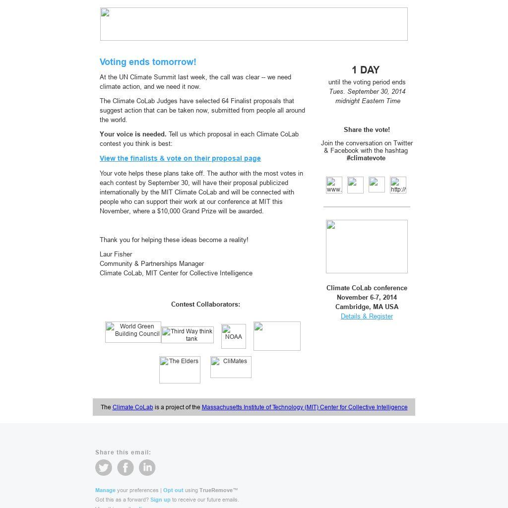 Your vote helps these plans take off. The author with the most votes in each contest by September 30, will have their proposal publicized internationally by the MIT Climate CoLab and will be connected with people who can support their work at our conference at MIT this November, where a $10,000 Grand Prize will be awarded.