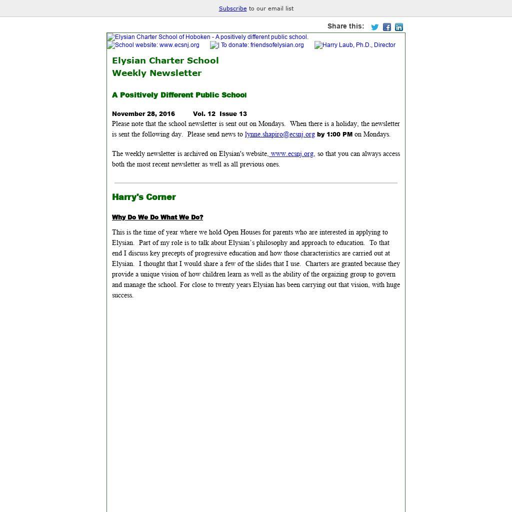 The weekly newsletter is archived on Elysian's website, www.ecsnj.org, so that you can always access both the most recent newsletter as well as all previous ones.