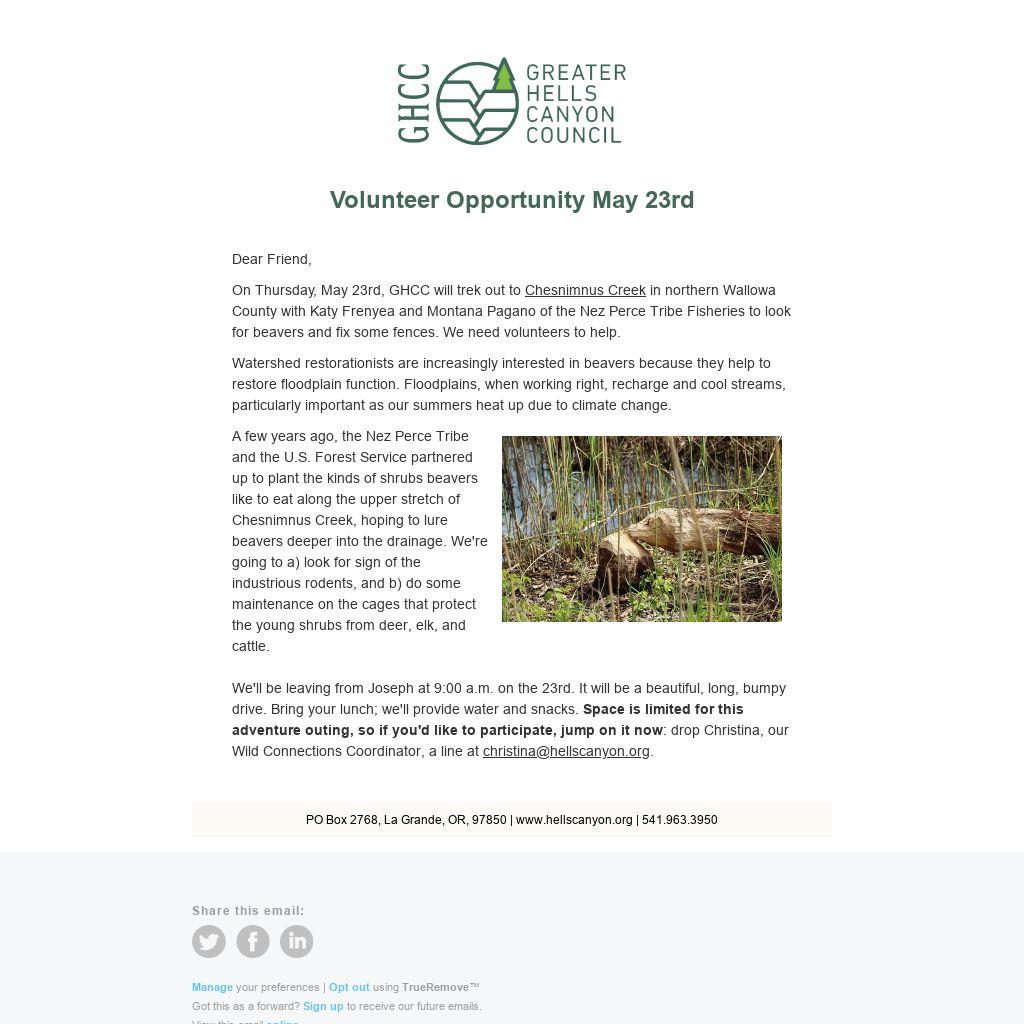 On Thursday, May 23rd, GHCC will trek out to Chesnimnus Creek in northern Wallowa County with Katy Frenyea and Montana Pagano of the Nez Perce Tribe Fisheries to look for beavers and fix some fences. We need volunteers to help. Watershed restorationists are increasingly interested in beavers because they help to restore floodplain function. Floodplains, when working right, recharge and cool streams, particularly important as our summers heat up due to climate change.