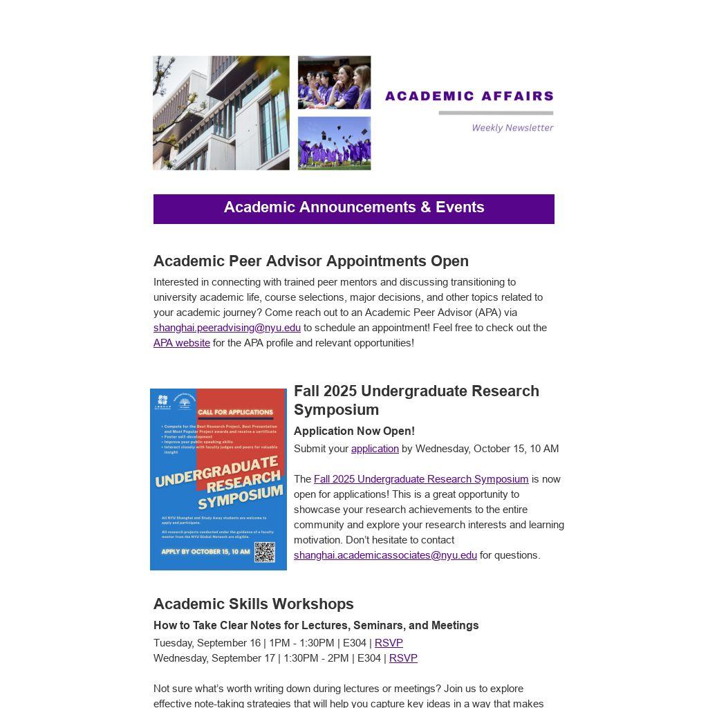 Academic Peer Advisor Appointments OpenInterested in connecting with trained peer mentors and discussing transitioning to university academic life, course selections, major decisions, and other topics related to your academic journey? Come reach out to an Academic Peer Advisor (APA) via shanghai.peeradvising@nyu.edu to schedule an appointment! Feel free to check out the APA website for the APA profile and relevant opportunities!