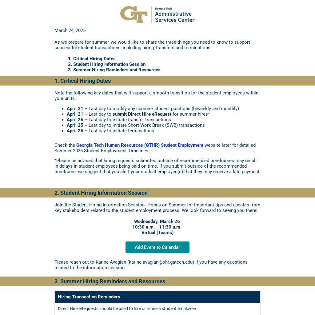 Check the Georgia Tech Human Resources (GTHR) Student Employment website later for detailed Summer 2025 Student Employment Timelines.