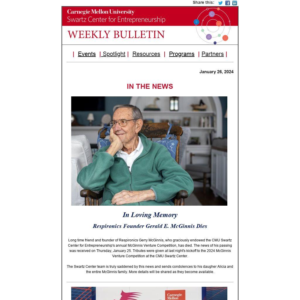 | Long time friend and founder of Respironics Gerry McGinnis, who graciously endowed the CMU Swartz Center for Entrepreneurship's annual McGinnis Venture Competition, has died. The news of his passing was received on Thursday, January 25. Tributes were given at last night's kickoff to the 2024 McGinnis Venture Competition at the CMU Swartz Center.