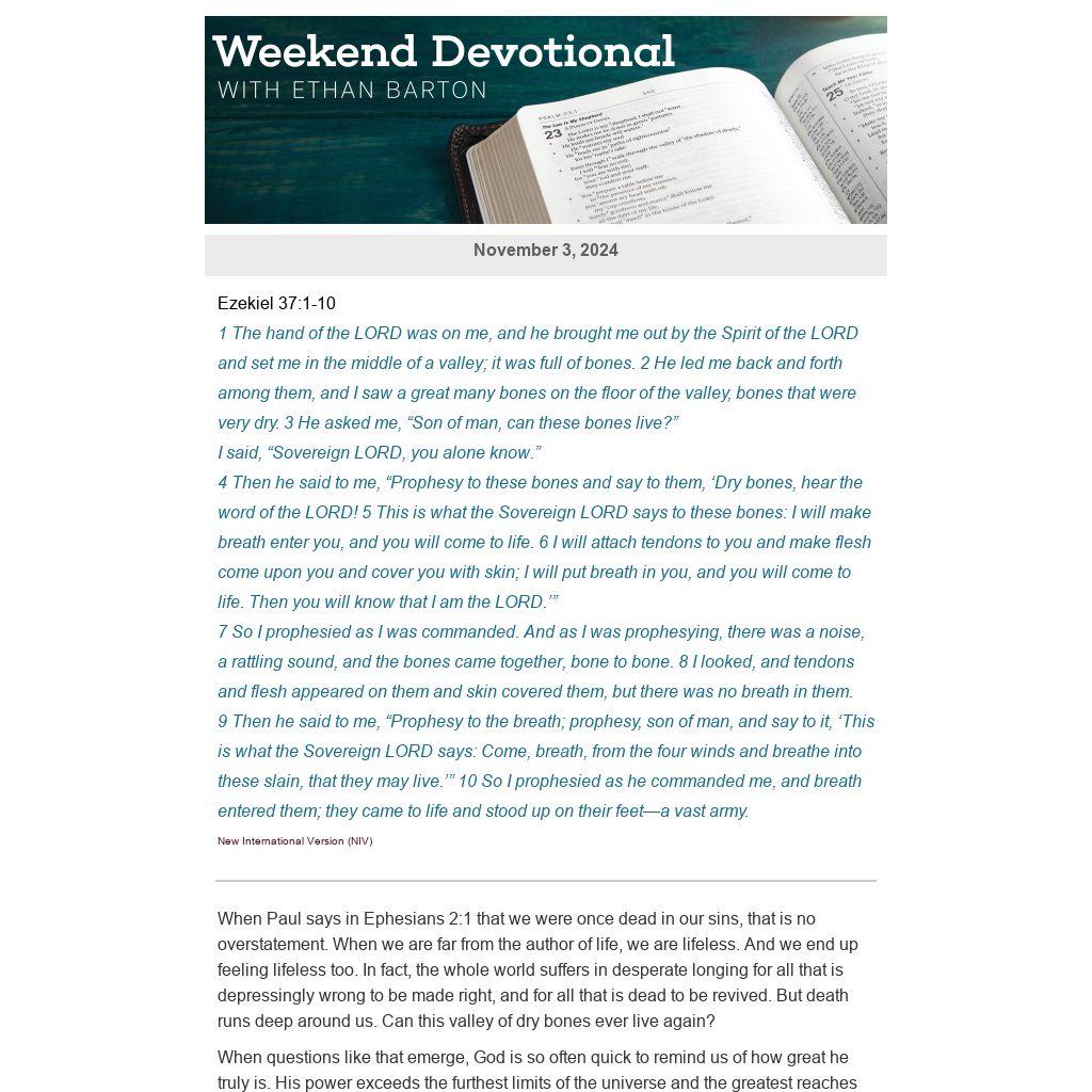 When Paul says in Ephesians 2:1 that we were once dead in our sins, that is no overstatement. When we are far from the author of life, we are lifeless. And we end up feeling lifeless too. In fact, the whole world suffers in desperate longing for all that is depressingly wrong to be made right, and for all that is dead to be revived. But death runs deep around us. Can this valley of dry bones ever live again?