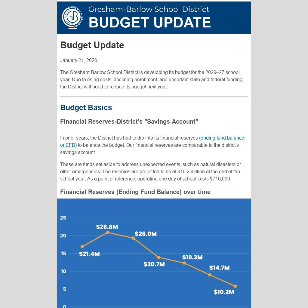 The Gresham-Barlow School District is developing its budget for the 2026–27 school year. Due to rising costs, declining enrollment, and uncertain state and federal funding, the District will need to reduce its budget next year.