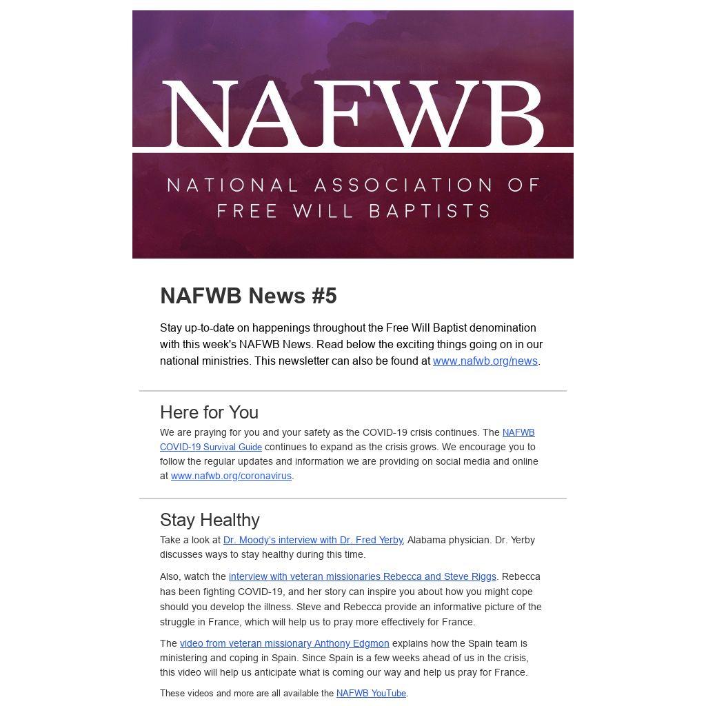 Stay up-to-date on happenings throughout the Free Will Baptist denomination with this week's NAFWB News. Read below the exciting things going on in our national ministries. This newsletter can also be found at www.nafwb.org/news.