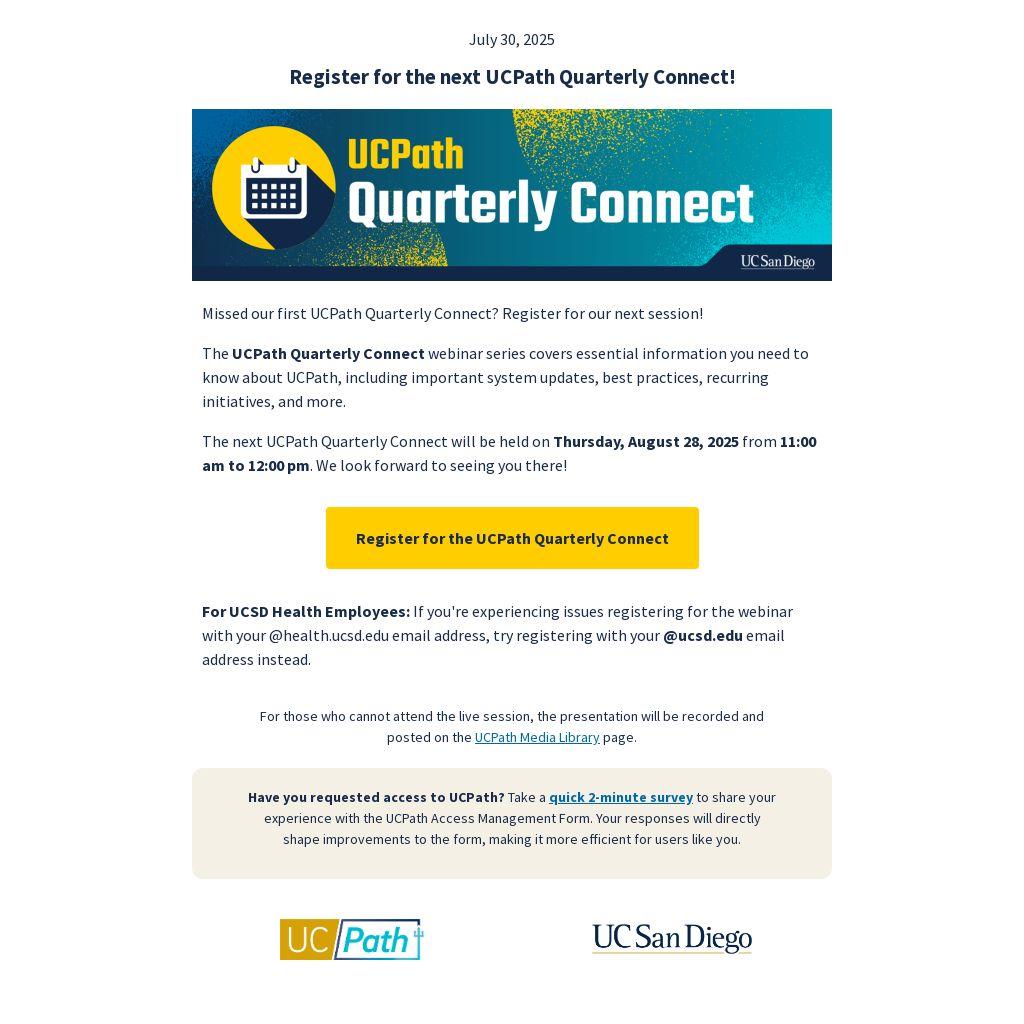 The next UCPath Quarterly Connect will be held on Thursday, August 28, 2025 from 11:00 am to 12:00 pm. We look forward to seeing you there!