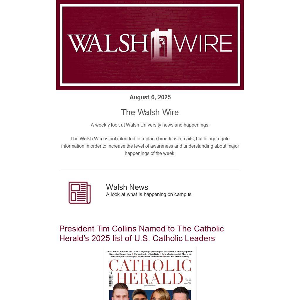 Congratulations to President Tim Collins for being named to The Catholic Herald’s 2025 list of U.S. Catholic Leaders—a well-deserved honor that reflects his steadfast commitment to faith-informed leadership and academic excellence. His visionary guidance has not only strengthened the mission and values of Walsh University, but have contributed to the greater Catholic education landscape, uplifting the broader community and embodying Walsh's core values of community, excellence, integrity, service, and faith. President Collins continues to be a beacon of inspiration, demonstrating how principled leadership can shape a more compassionate and just society and contribute to the common good. This incredible recognition affirms his impactful journey and enduring legacy. See the full list here.