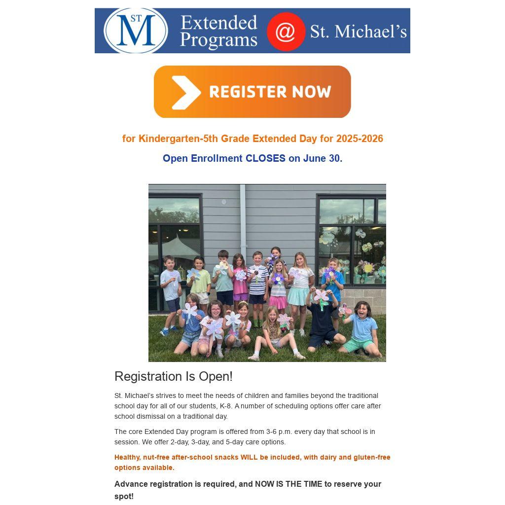Mark your calendars for our Extended Day Open House, August 25! The first full day of Extended Day is Wednesday, August 27!