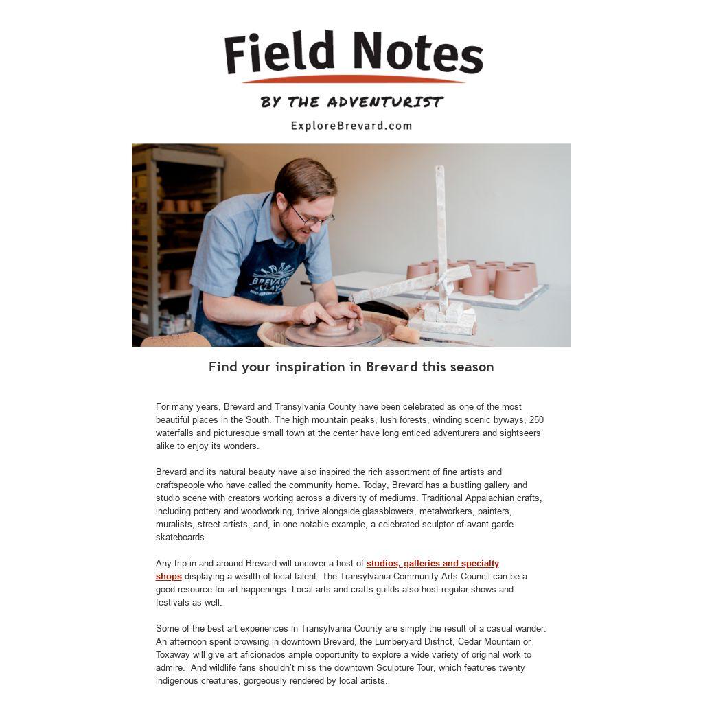Brevard and its natural beauty have also inspired the rich assortment of fine artists and craftspeople who have called the community home. Today, Brevard has a bustling gallery and studio scene with creators working across a diversity of mediums. Traditional Appalachian crafts, including pottery and woodworking, thrive alongside glassblowers, metalworkers, painters, muralists, street artists, and, in one notable example, a celebrated sculptor of avant-garde skateboards.