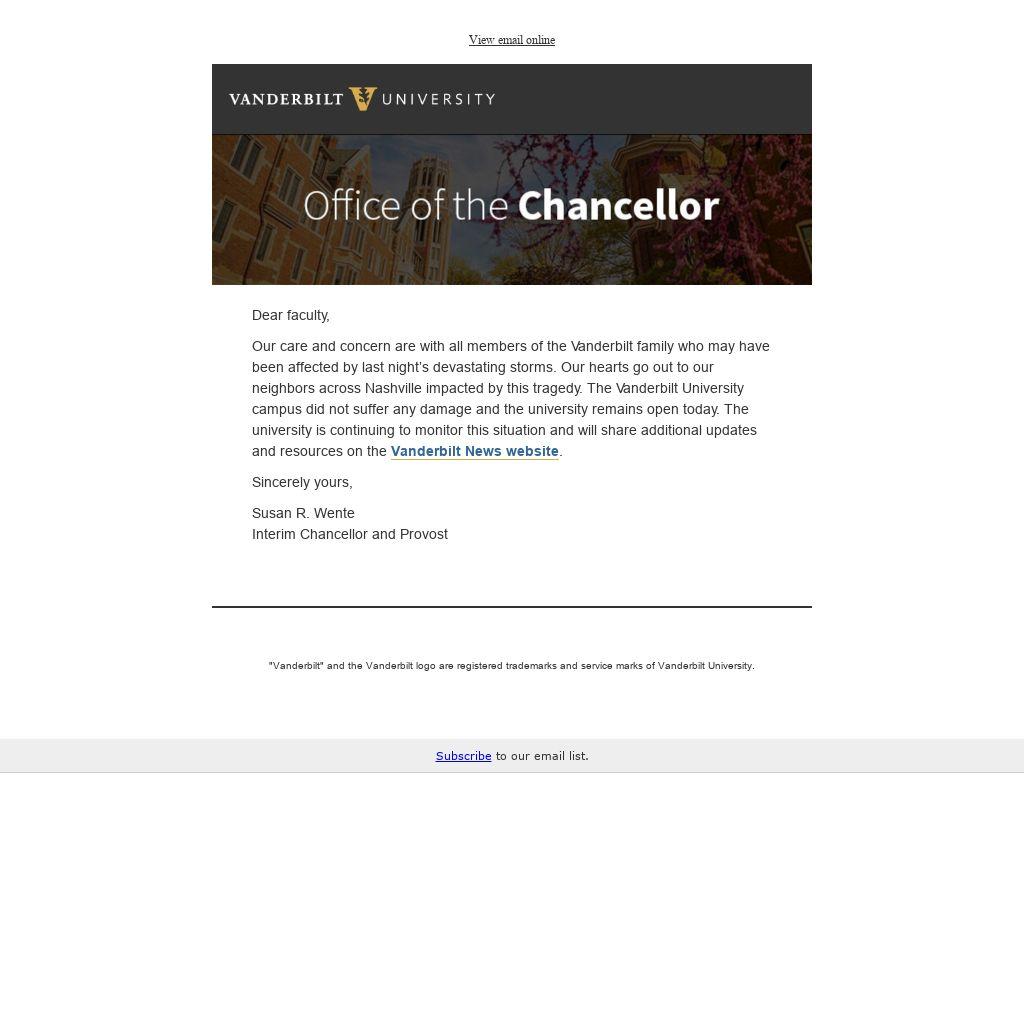 Our care and concern are with all members of the Vanderbilt family who may have been affected by last night’s devastating storms. Our hearts go out to our neighbors across Nashville impacted by this tragedy. The Vanderbilt University campus did not suffer any damage and the university remains open today. The university is continuing to monitor this situation and will share additional updates and resources on the