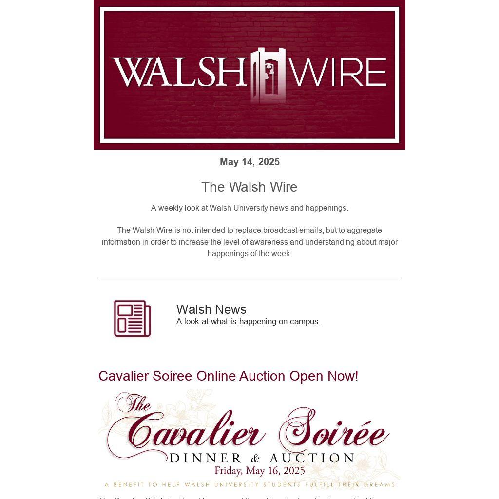 The Cavalier Soirée is almost here — and the online silent auction is now live! From exclusive experiences to one-of-a-kind items, there's something for everyone, and all proceeds go directly toward helping Walsh students bridge the financial gap to achieve their first destination, their future, and their life’s purpose. Even if you can’t join us in person this Friday, May 16, you can still be part of the impact by placing your bids now at www.walsh.edu/soiree. Let the bidding begin!