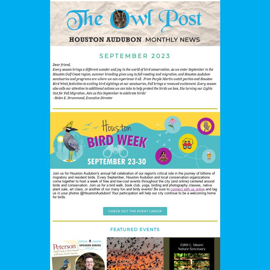 Join us for Houston Audubon's annual fall celebration of our region's critical role in the journey of billions of migratory and resident birds. Every September, Houston Audubon and local conservation organizations come together to host a week of free and low-cost events throughout the city (and online) centered around birds and conservation. Join us for a bird walk, book club, yoga, birding and photography classes, native plant sale, art class, or another of our many fun and birdy events! Be sure to connect with us online and tag us in your photos @HoustonAudubon! Your participation will help our city continue to be a welcoming home for birds.