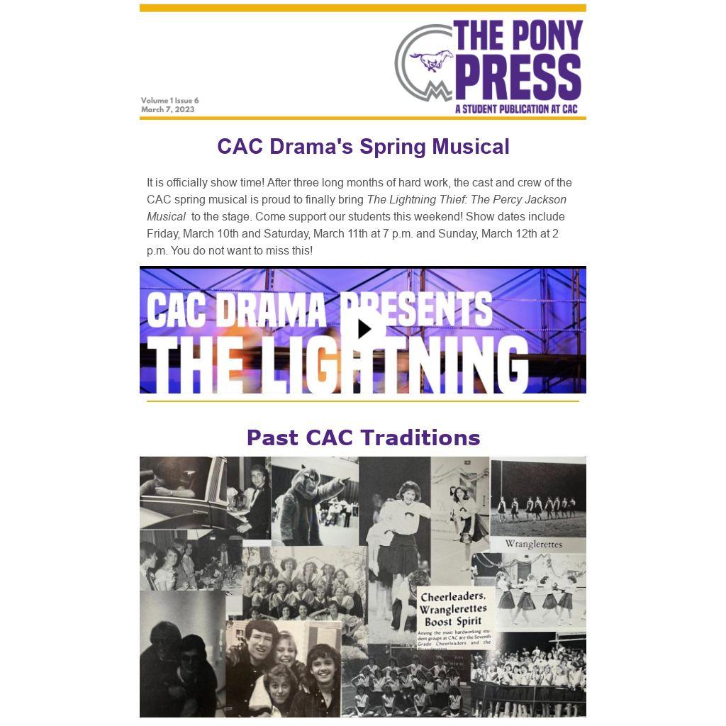 It is officially show time! After three long months of hard work, the cast and crew of the CAC spring musical is proud to finally bring The Lightning Thief: The Percy Jackson Musical to the stage. Come support our students this weekend! Show dates include Friday, March 10th and Saturday, March 11th at 7 p.m. and Sunday, March 12th at 2 p.m. You do not want to miss this!
