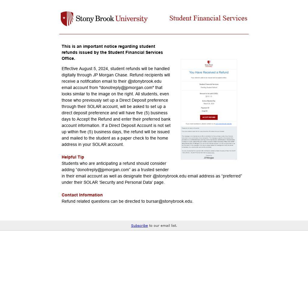 Students who are anticipating a refund should consider adding “donotreply@jpmorgan.com” as a trusted sender in their email account as well as designate their @stonybrook.edu email address as “preferred” under their SOLAR ‘Security and Personal Data’ page.