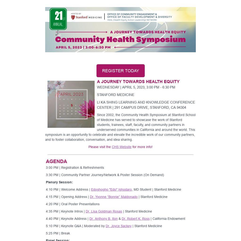 Since 2002, the Community Health Symposium at Stanford School of Medicine has served to showcase the work of Stanford students, trainees, staff, faculty, and community partners in underserved communities in California and around the world. This symposium is an opportunity to celebrate and elevate the incredible work of our community partners, and to foster collaboration, conversation, and idea sharing.