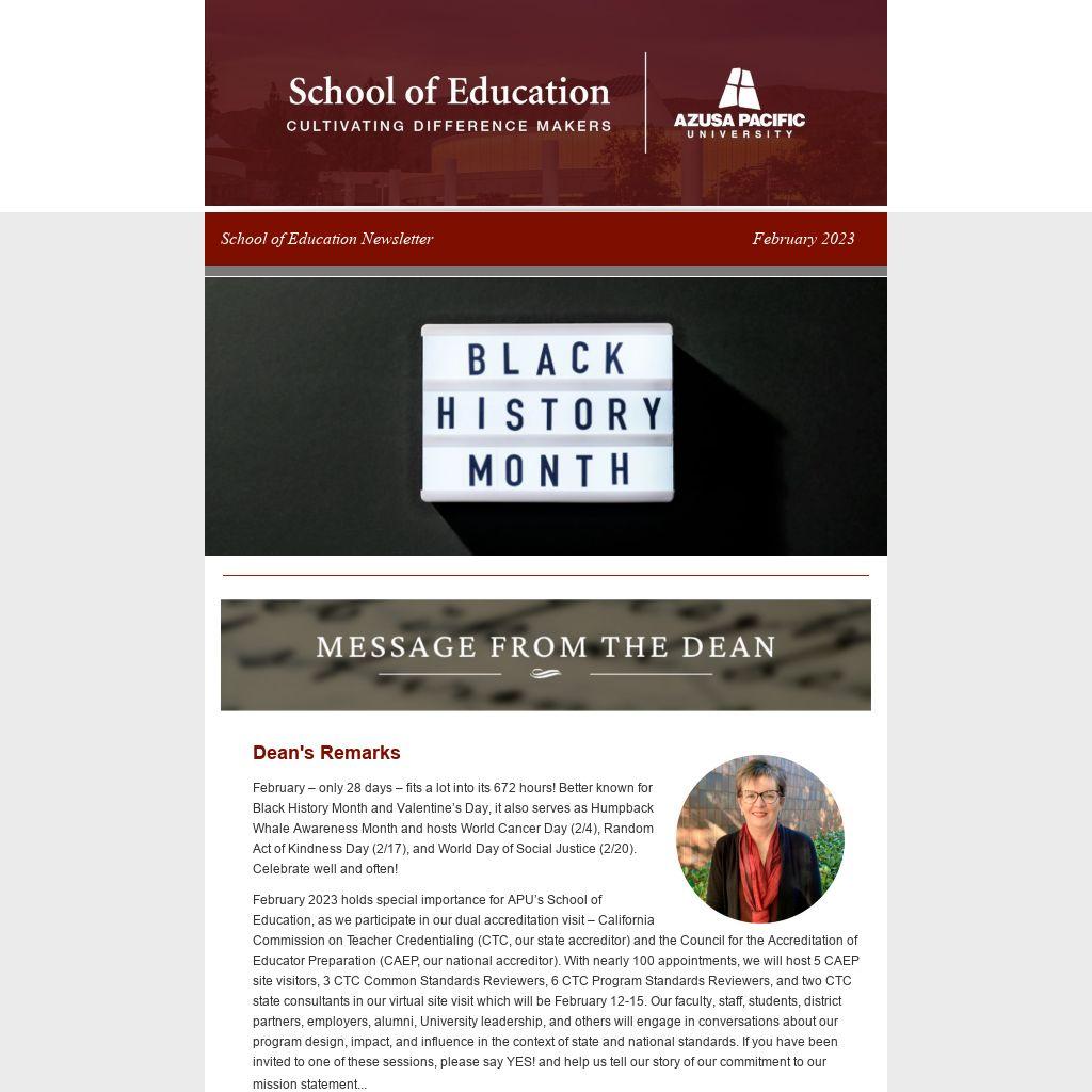 February 2023 holds special importance for APU’s School of Education, as we participate in our dual accreditation visit – California Commission on Teacher Credentialing (CTC, our state accreditor) and the Council for the Accreditation of Educator Preparation (CAEP, our national accreditor). With nearly 100 appointments, we will host 5 CAEP site visitors, 3 CTC Common Standards Reviewers, 6 CTC Program Standards Reviewers, and two CTC state consultants in our virtual site visit which will be February 12-15. Our faculty, staff, students, district partners, employers, alumni, University leadership, and others will engage in conversations about our program design, impact, and influence in the context of state and national standards. If you have been invited to one of these sessions, please say YES! and help us tell our story of our commitment to our mission statement...